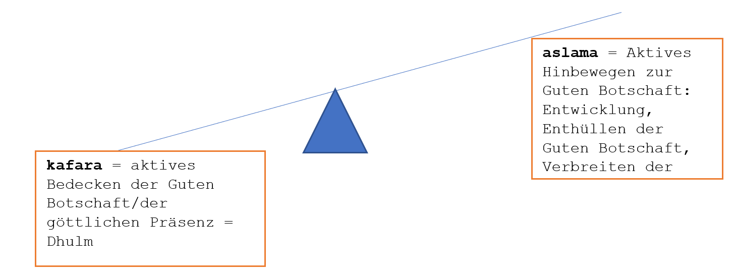 Diese Gute Botschaft ist völlig einfach und freundlich und genial gleichermassen. Sie ist der Gipfelpunkt eines jahrtausendelangen Weges des Menschen zu einem klaren Denkmodell in Bezug auf das EINE GÖTTLICHE, von den Tiergöttern Ägyptens zu dem geopferten Gottessohn der Christen. Alles, was diese einfache und freundliche Botschaft überlagert und unfreundlich oder kompliziert macht, ist ein Kafara, ein Bedecken dieser Guten Botschaft.